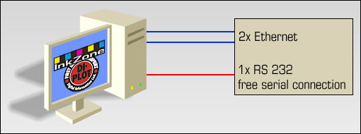We recommend installing the DI-Plot software on a dedicated PC running Microsoft Windows XP Professional or Windows 7 Professional. The perfect hardware is an CPU Intel Core 2 Duo, 3.x GHz, 2 GB RAM, 80 GB hard disk, 10,000 RPM, 19-inch TFT monitor (touch screen recommended), USB. There are two important special hardware requirements: the PC should contain two Ethernet boards. One Ethernet line is connected to the customer's network (hub or switch), the other one is using a crossover cable and drives the InkZone Box/Card. This kind of installation ensures a clear separation between the box and the customer's network. And the PC should contain a free serial connetion (RS232) to drive the InkZone Tape and Strip solution.